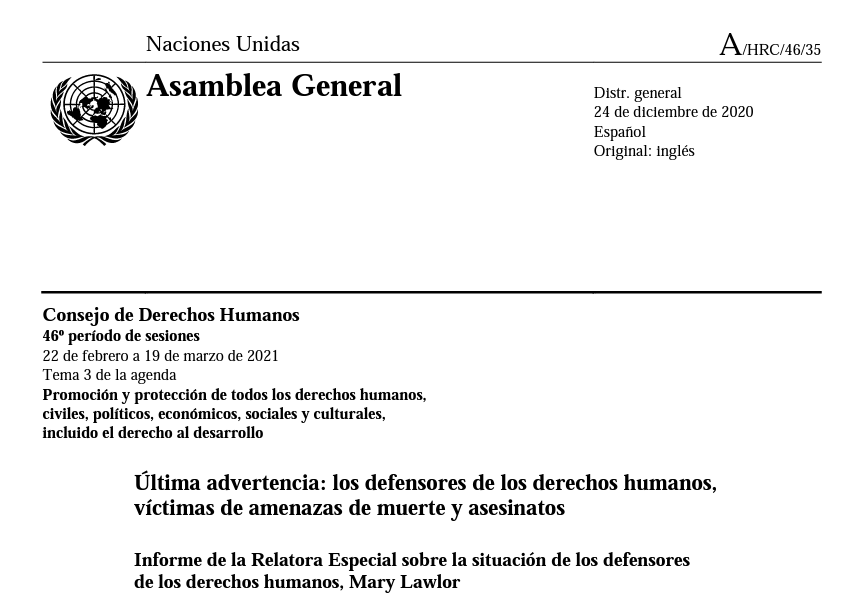 Última advertencia: los defensores de los derechos humanos, víctimas de amenazas de muerte y asesinatos Informe de la Relatora Especial sobre la situación de los defensores de los derechos humanos, Mary Lawlor